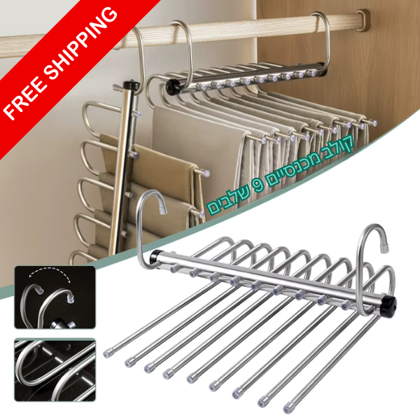 העיצוב הייחודי מאפשר לגבש 9 פריטים שעד כה היום אופקיים לכדי קולב אחד אנכי מה שחוסך עד 80% מקום באופן מיידי.